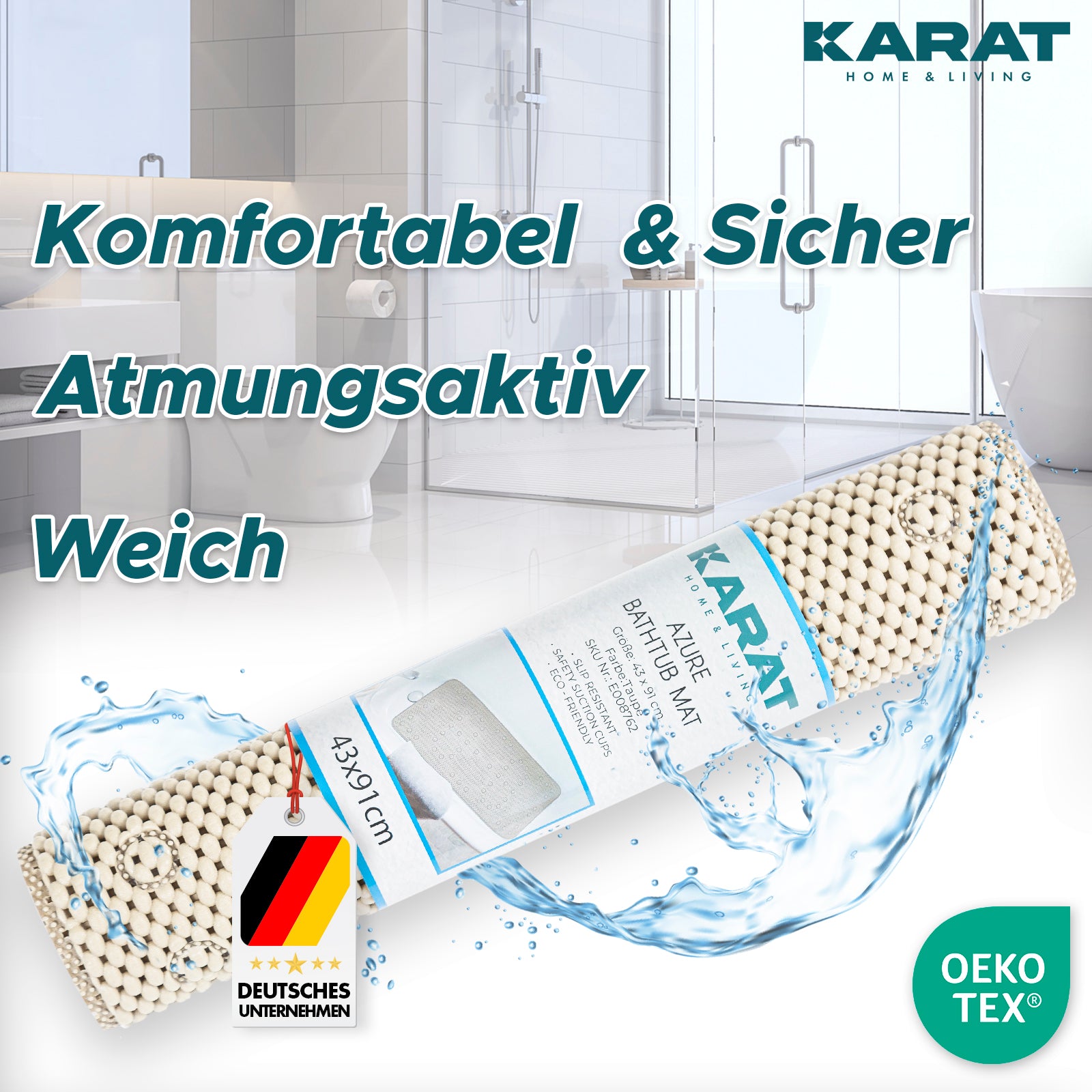 Die Badewannenmatte Azure überzeugt durch ihre rutschfeste Oberfläche, die für einen sicheren Stand sorgt, egal ob die Matte trocken oder nass ist. Sie ist nicht nur funktional, sondern auch äußerst komfortabel. Das weiche Material bietet eine angenehme Unterlage, die das Baden und Duschen zu einem entspannenden Erlebnis macht. Zudem ist die Matte atmungsaktiv, was für zusätzlichen Komfort sorgt.