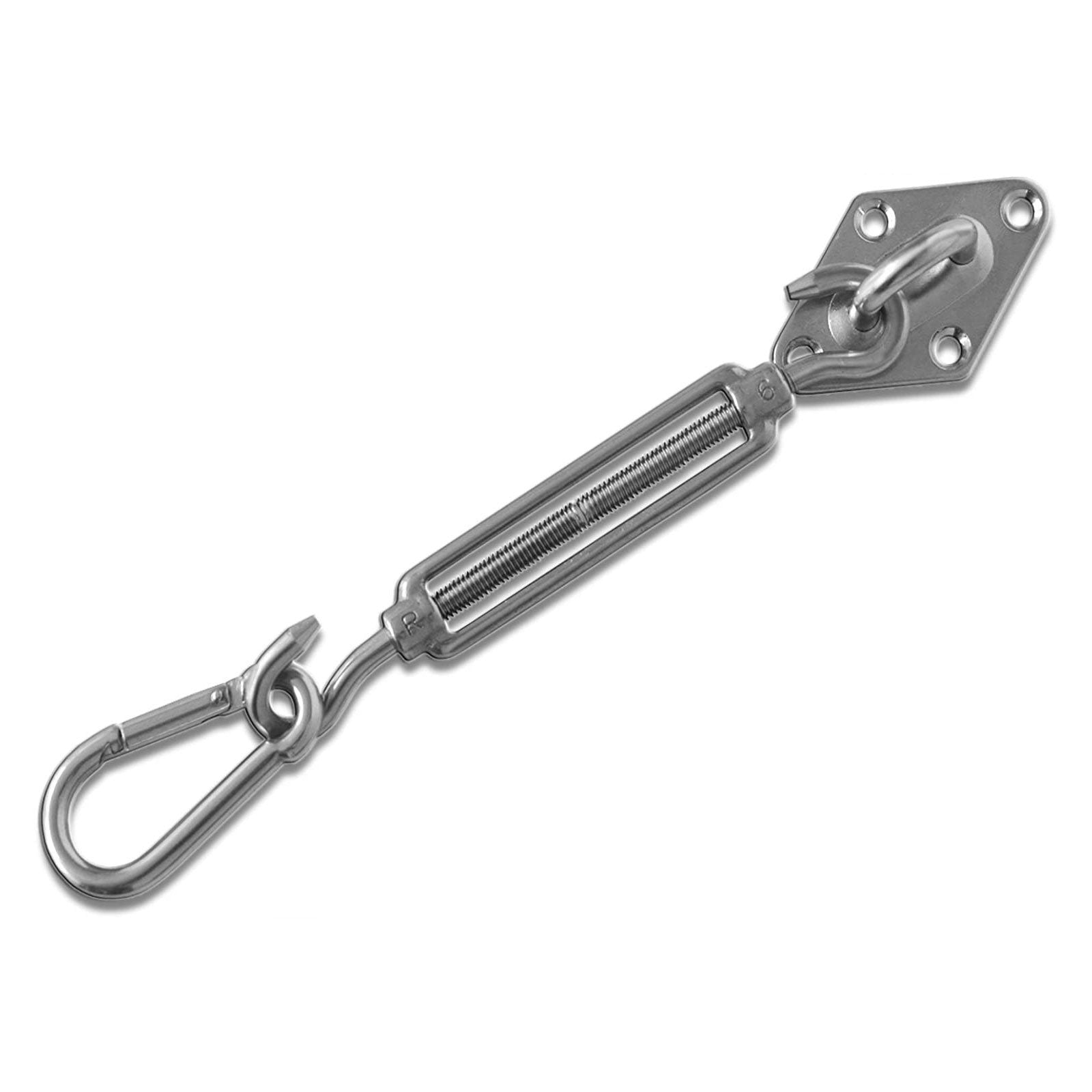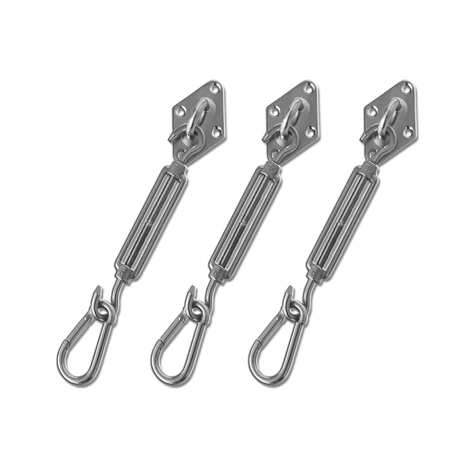 Abhängig davon, ob Sie das Montage-Kit für ein rechteckiges oder dreieckiges Sonnensegel benötigen, erhalten Sie die Einzelteile in dreifacher bzw. vierfacher Ausfertigung, um jedes Eck des Segels befestigen und spannen zu können. Für beide Sonnensegel-Varianten steht das passende Set zur Verfügung.
