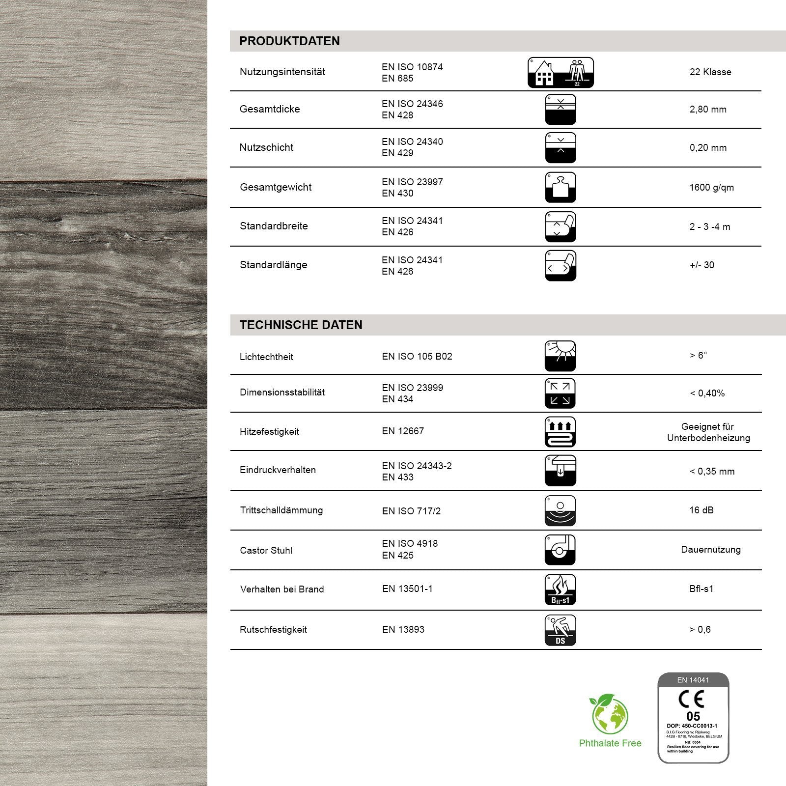 Mit diesem eleganten PVC Boden eröffnen sich Ihnen tolle Gestaltungsmöglichkeiten. In zahlreichen Designs verfügbar, besticht der Vinylboden durch seinen natürlichen Charakter und überzeugt sowohl in authentischem Holzdekor, als auch in Stein- oder Fliesenoptik. Die vielfältigen Designbeläge bieten eine ansprechende Alternative zu Parkett oder Laminat und sind im Handumdrehen verlegt. So kann ein Designboden wie ein alter Dielenboden eine gemütliche Wohnatmosphäre verbreiten und bietet gleichzeitig einen angenehmen Gehkomfort. Vor allem in Küche und Bad eignet sich der Boden dank seiner unempfindlichen Oberfläche, sowie seiner rutschfesten Eigenschaft, besonders. Verschiedene Wohntrends und Einrichtungsstile wie Landhaus, Retro, Vintage oder Maritim lassen sich mit Hilfe des Designbelags spielend leicht umsetzen. Auf diese Weise passt sich der zeitlose Vinyl-Designbelag ganz Ihren persönlichen Vorstellungen an und fügt sich in Wohnzimmer, Schlafzimmer, Esszimmer, Kinderzimmer und Arbeitszimmer wunderbar ein.