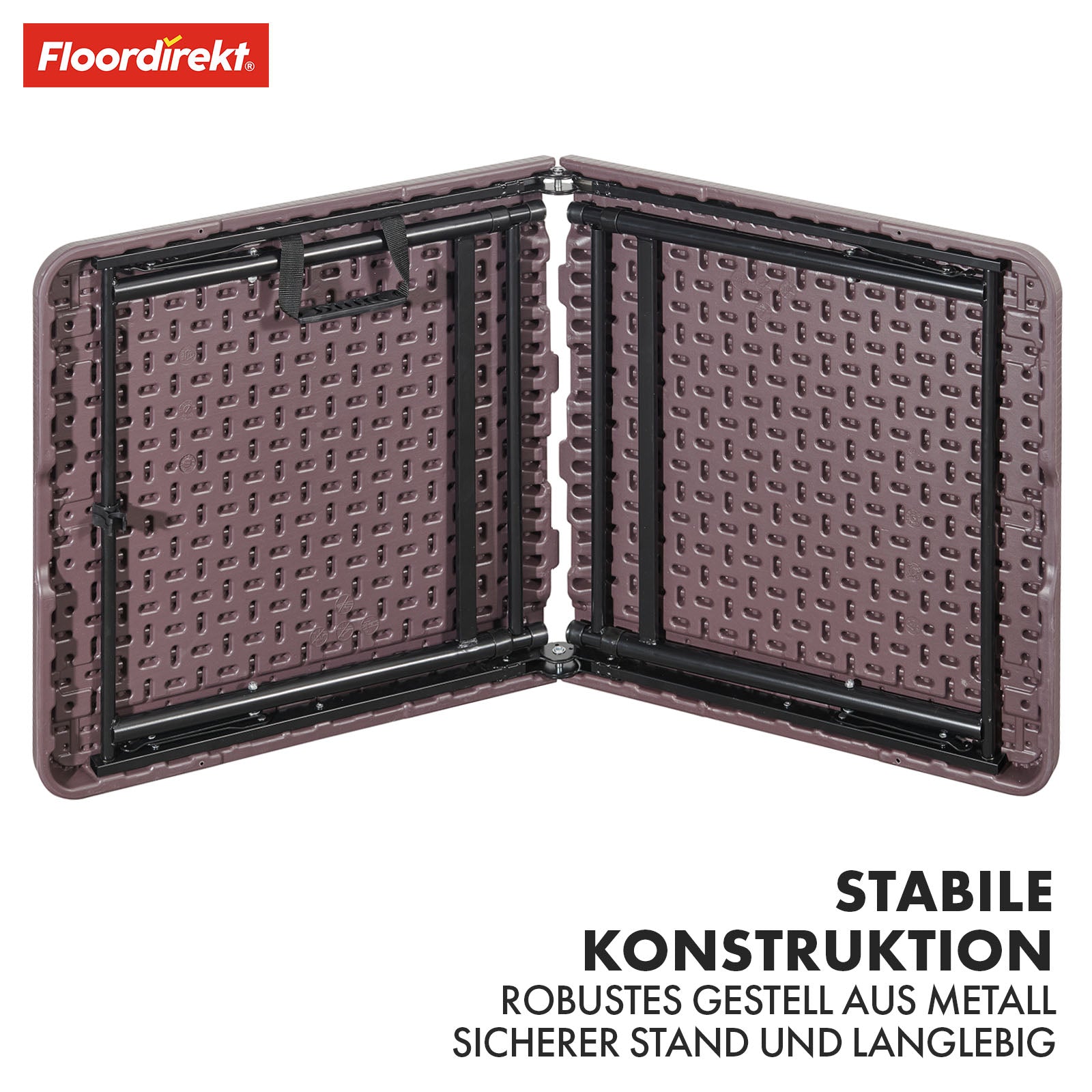 Der Tisch ist in einer ansprechenden braunen Farbe erhältlich, die sich harmonisch in verschiedene Umgebungen integriert. Durch die Kombination aus Kunststoff und Stahl ist der Tisch nicht nur pflegeleicht, sondern auch äußerst langlebig und wetterbeständig.
