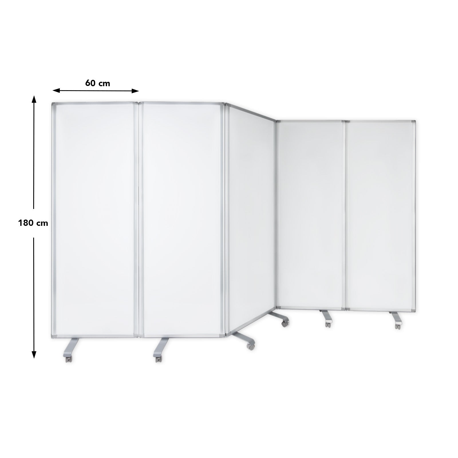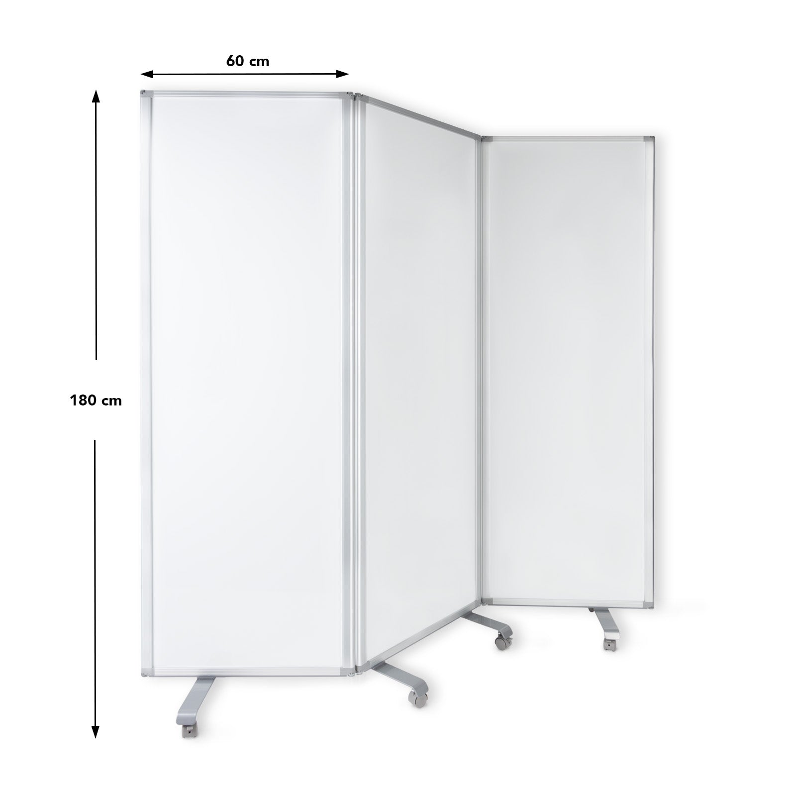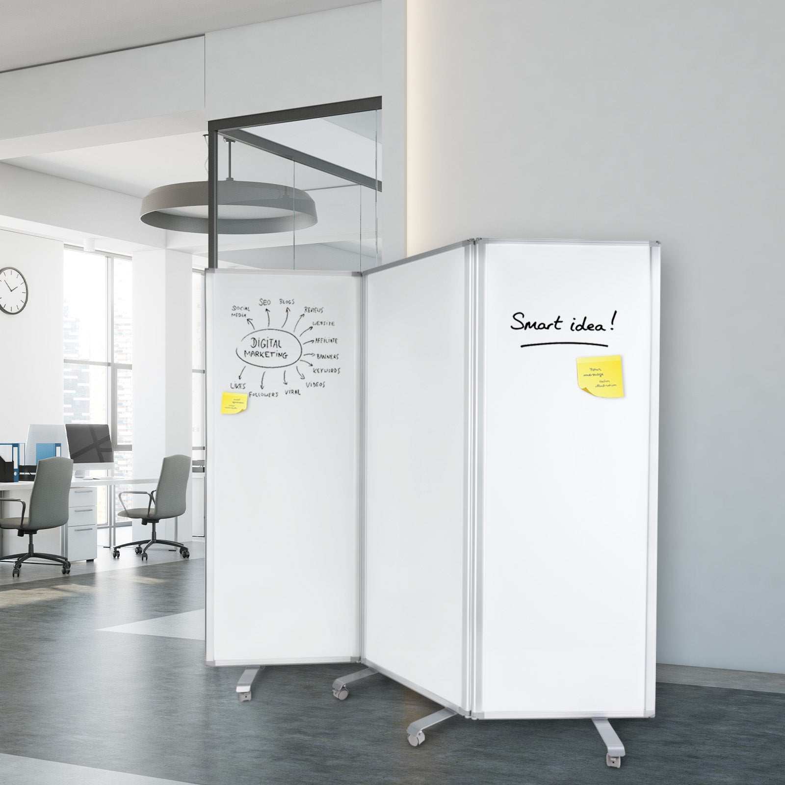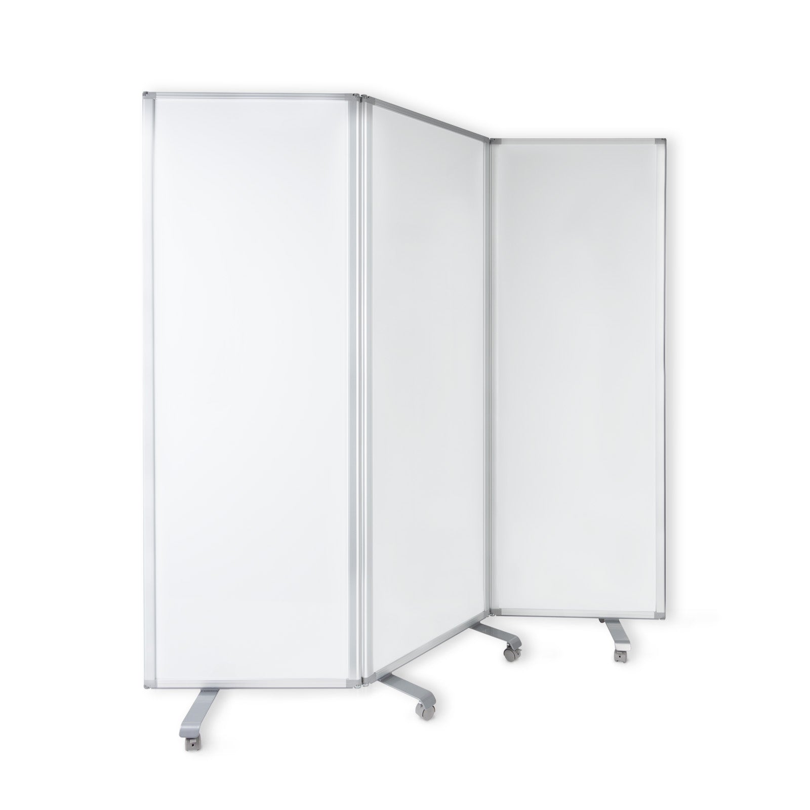 Das mobile, klappbare Whiteboard besteht aus drei beziehungsweise 5 Tafeln und einem robusten Aluminiumrahmen. Die einzelnen Whiteboardtafeln sind flexibel verstellbar und lassen sich um 360° drehen. Ob als Präsentationswand oder als Trennwand, mit unserem mobilem Whiteboard sind Sie bestens ausgerüstet.