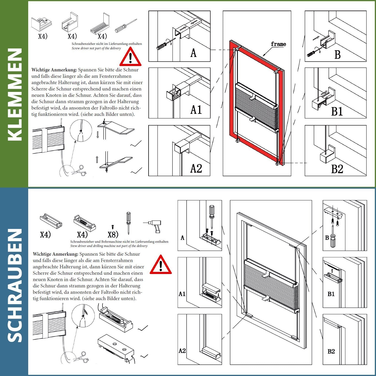 Erhältlich ist das Plissee in unterschiedlichen Breiten. In Verbindung mit der grossen Farbauswahl findet sich somit für nahezu jede Fenstergrösse und jeden Geschmack das richtige Faltrollo. Befestigen lassen sich die Plissees auf zweierlei Weise. Entweder durch Verwendung der Klemmhalterungen oder durch direktes Verschrauben im Fensterrahmen. Alle benötigten Montageteile liegen dem Faltrollo bei.