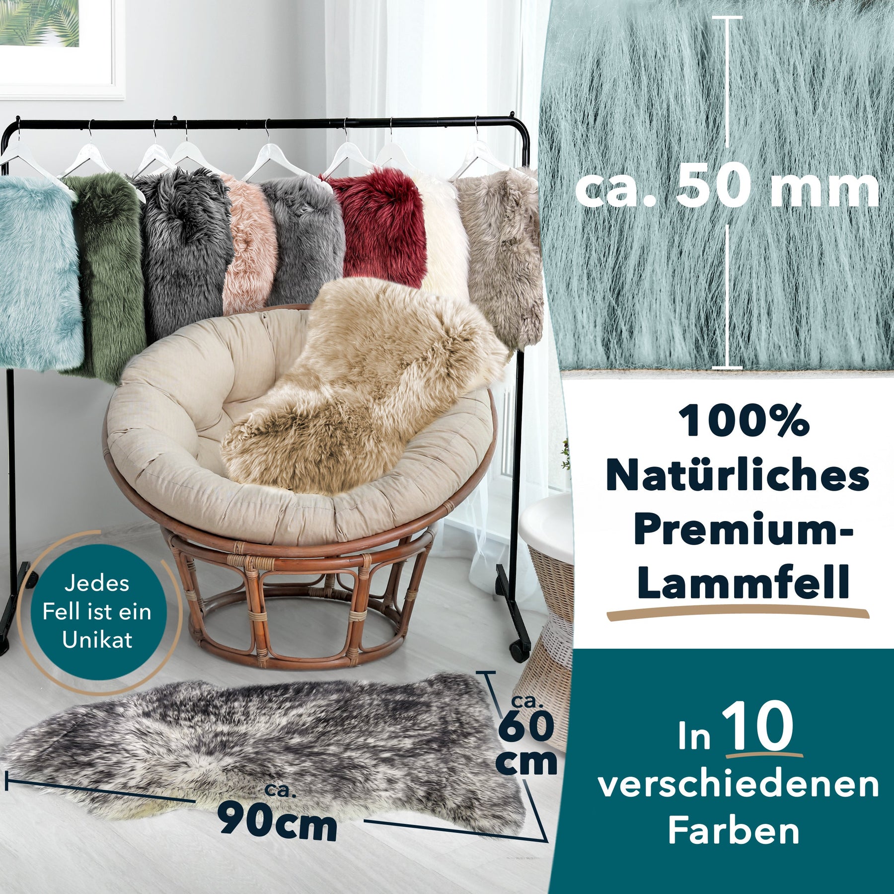 Auf Wiedersehen, stressiger Alltag. Egal, ob Sie das Echtfell auf Sesseln, Stühlen oder Sofas verwenden - sie behalten ihre Form und Schönheit auch über lange Zeit hinweg bei. "Audrey" ist aus geruchshemmender Schafwolle hergestellt und besitzt einen weichen Lederrücken, welcher ein gewisses Maß an Stabilität sicherstellt. Eine breite Palette von 10 Farben sorgt dafür, dass sich das Accessoire auch in Ihrer Lieblingsfarbe optimal in das Zimmer einfügen kann.