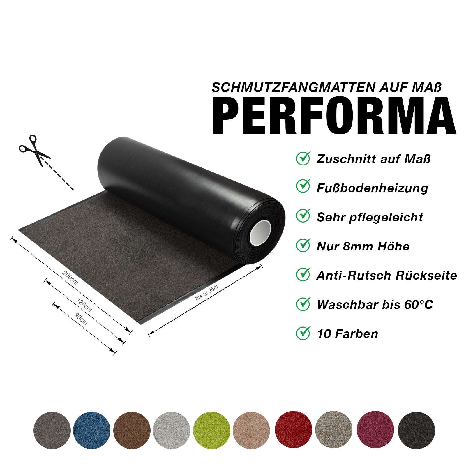 Schluss mit Schmutz und Nässe! Die Schmutzfangmatte Performa ist perfekt für gewerbliche Eingansbereiche geeignet und überzeugt durch eine hervorragende Reinigungsleistung, sowie eine hohe Absorptionsfähigkeit. So kann an den Schuhen haftender Schmutz und Nässe mit Leichtigkeit abgestriffen werden und es wird kein Schmutz nach innen getragen. Der Flor der Schmutzfangmatte entfernt hierbei die Verunreinigungen zuverlässig und hält diese bis zur nächsten Reinigung fest.