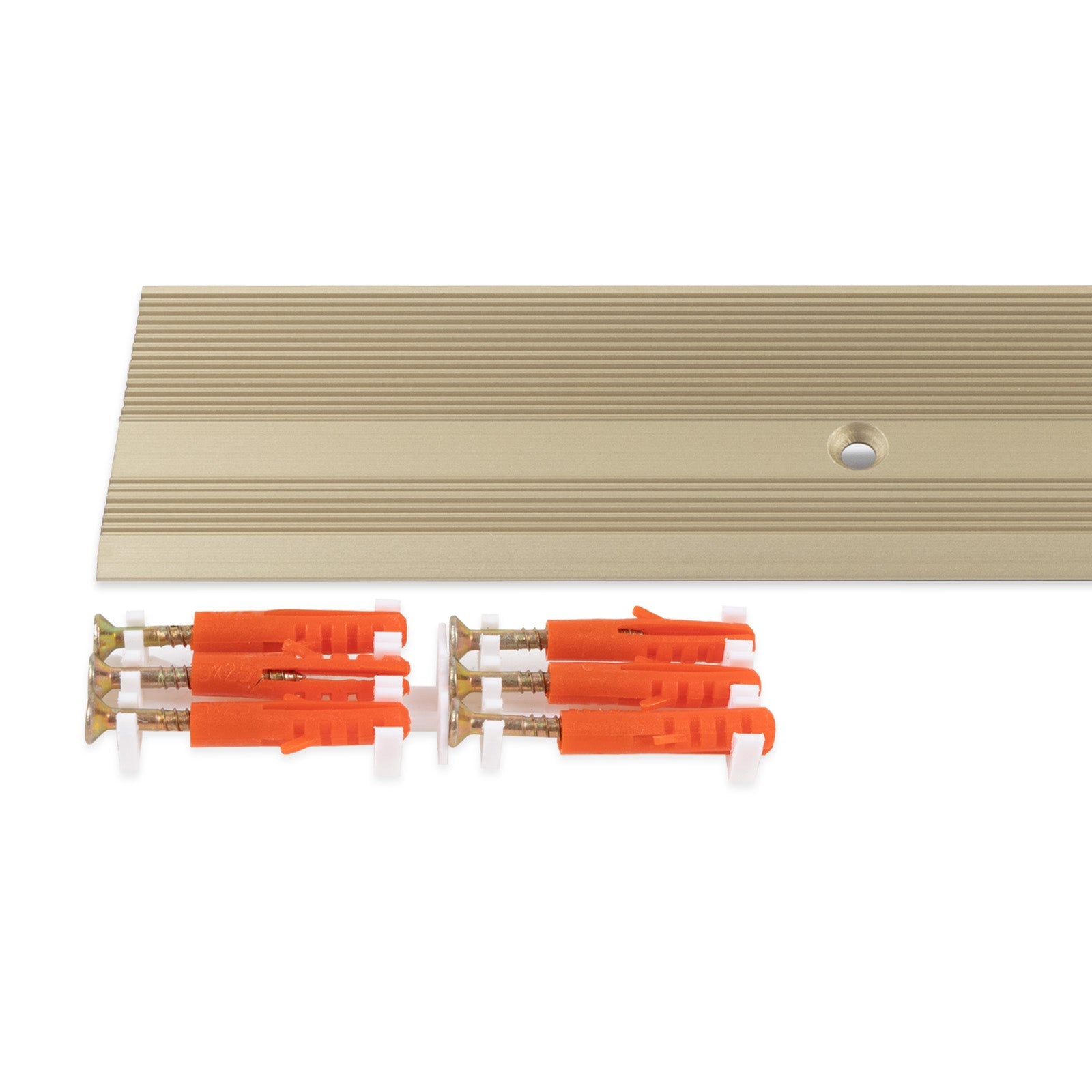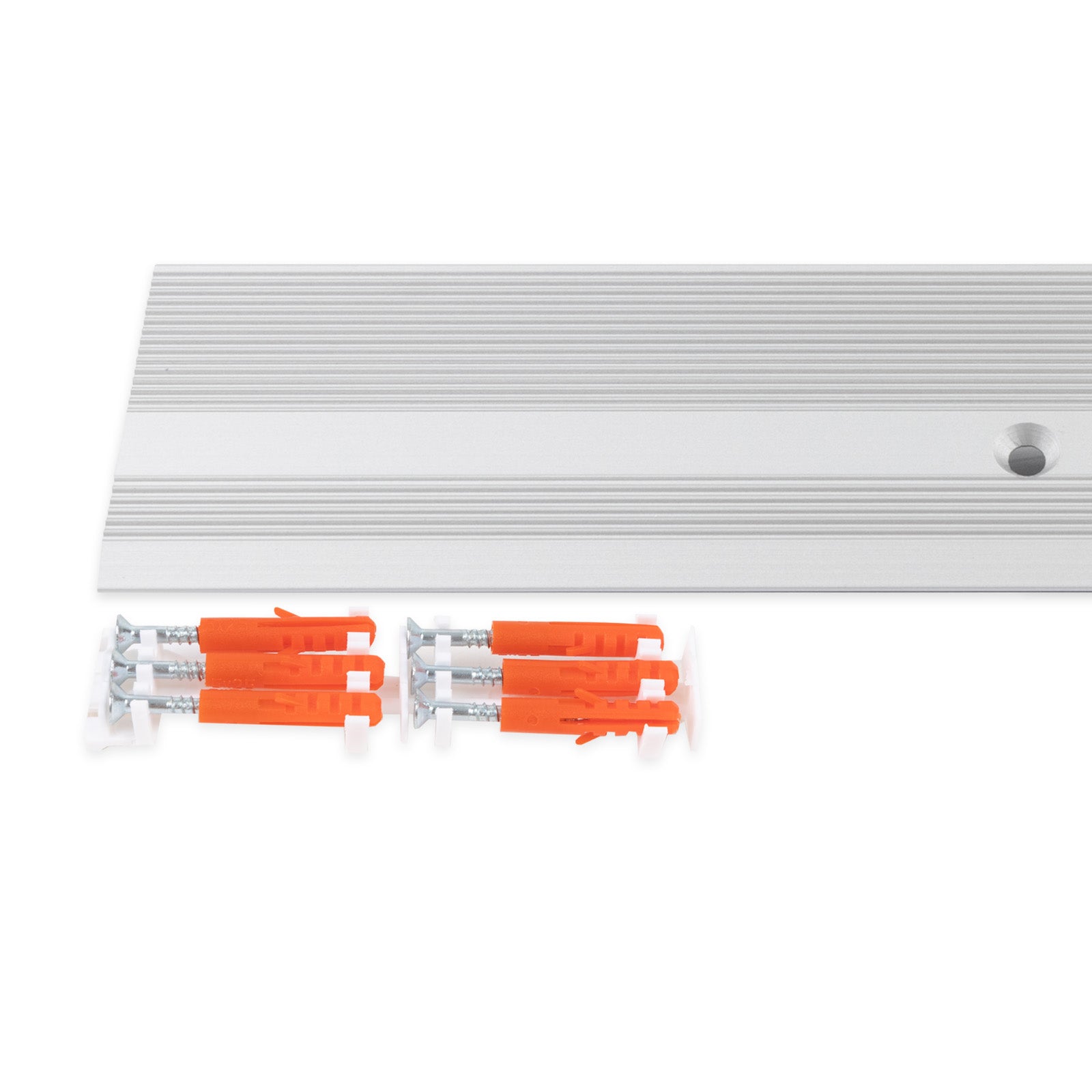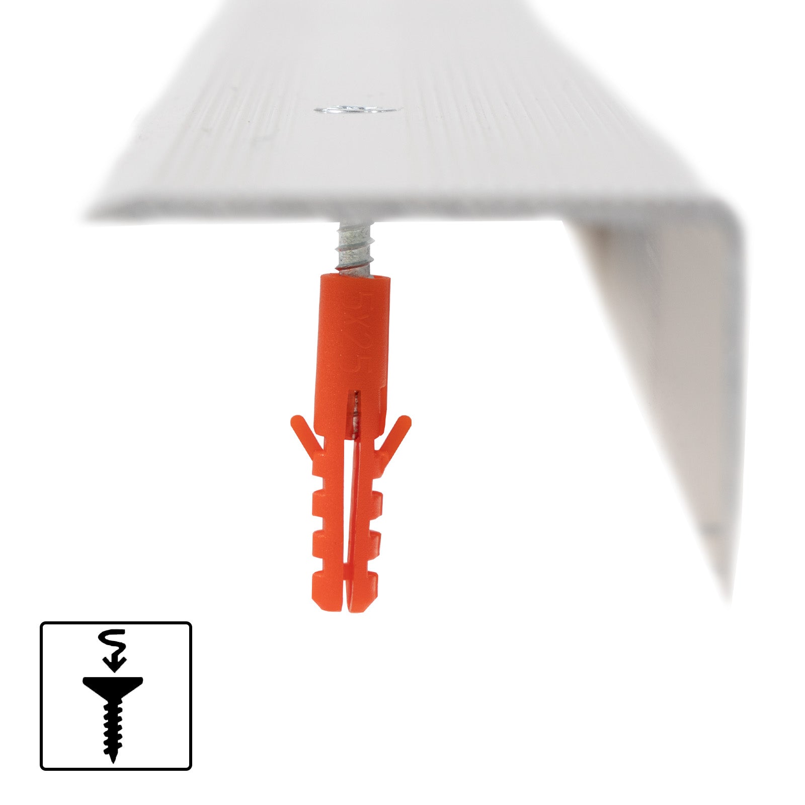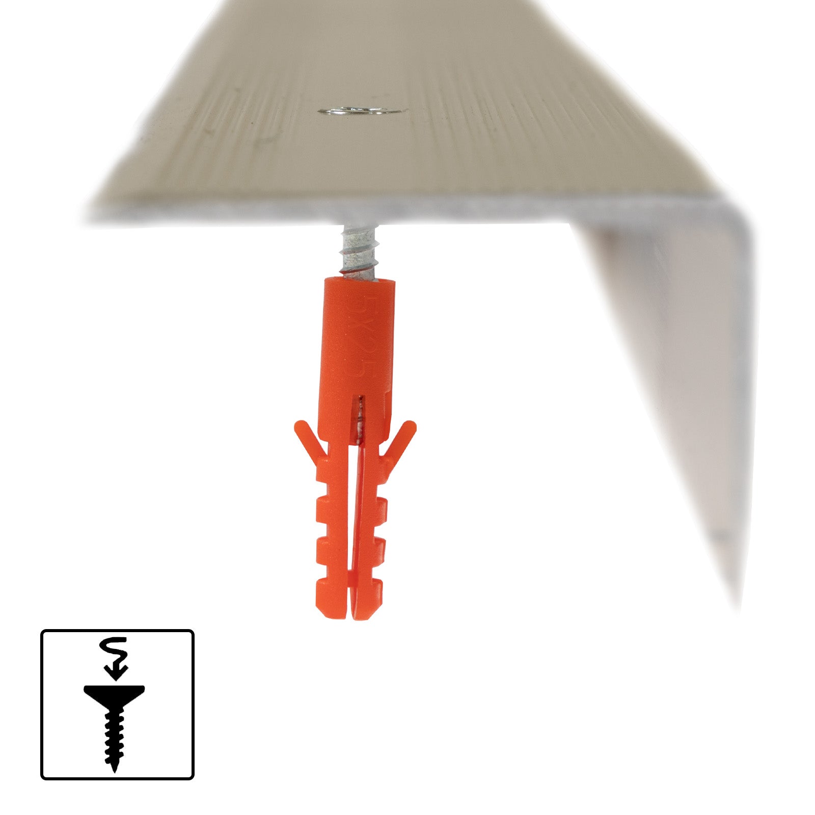 Schneiden Sie das Profil auf die gewünschte Länge zu. Die versenkt gebohrten Schraublöcher werden mittels eine Körners oder eines Bleistifts auf den Untergrund übertragen. Bei mineralischen Untergründen werden nun die angezeichneten Löcher gebohrt und nach entfernen des Bohrstaubs mit einem Dübel versehen. Anschließend kann das Profil aufgeschraubt werden. Bei Holzuntergründen kann je nach Holzart auch direkt durch die Schraublöcher angeschraubt werden.