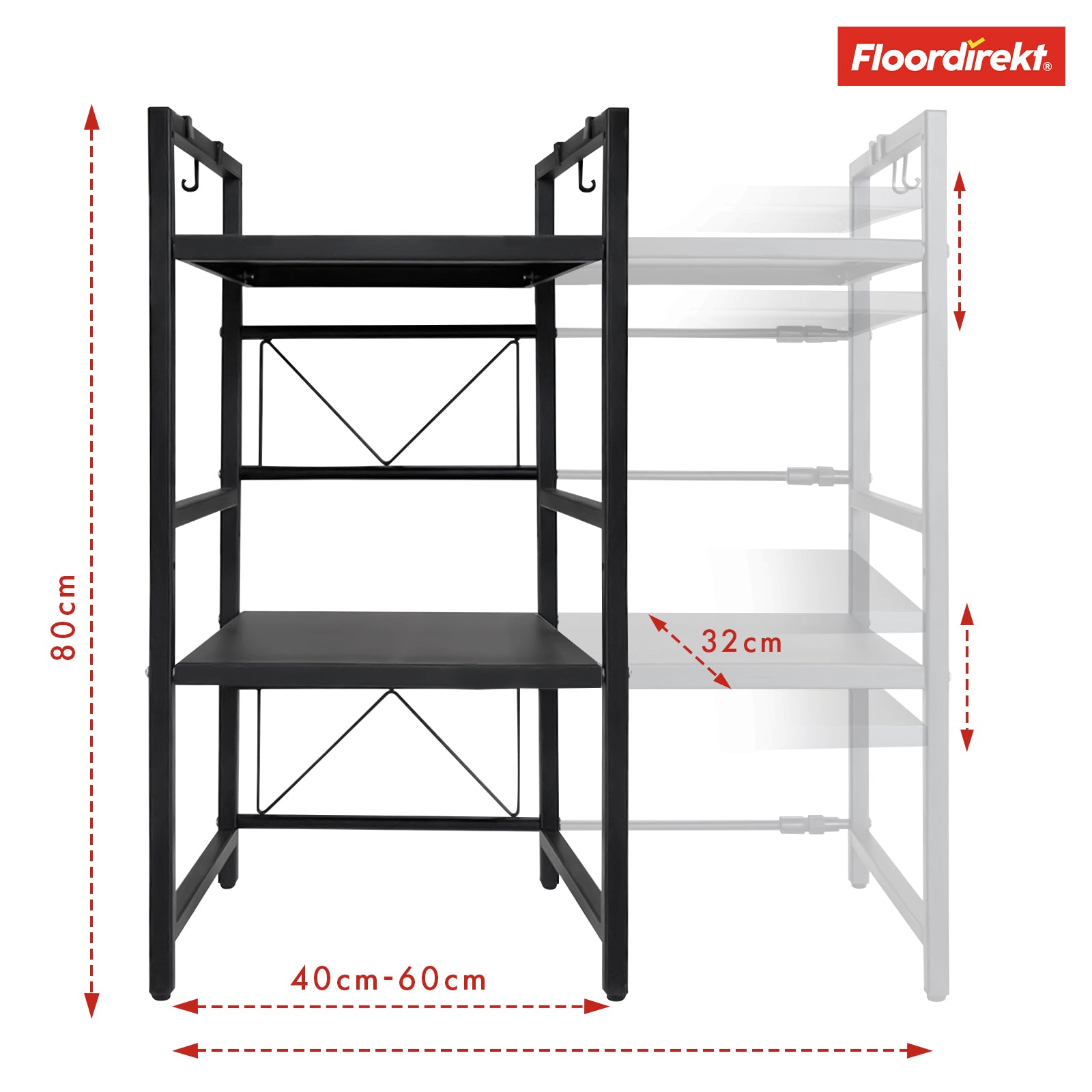 Mit einer Belastbarkeit von bis zu 50 kg pro Regalboden bietet das Durango-Regal ausreichend Stabilität für schwere Küchengeräte wie Mikrowellen, Backöfen oder Küchengeräte. Dank der 3 mitgelieferten Haken können Sie Küchenutensilien wie Pfannenwender, Schneebesen oder Handtücher griffbereit aufhängen, was zusätzlichen Stauraum schafft und die Nutzung des Regals noch effizienter macht.