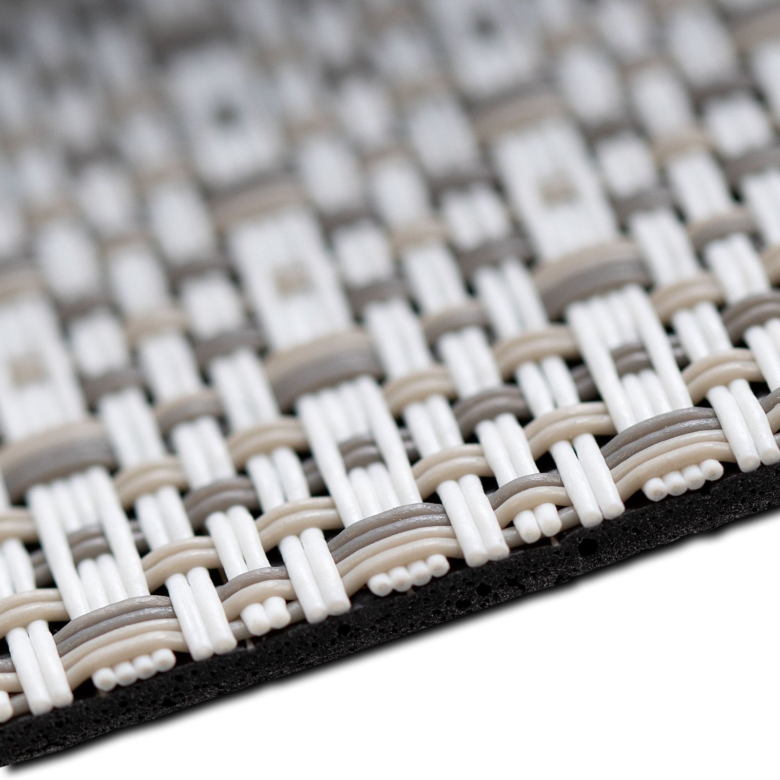 Die attraktive Badematte aus einem robusten Vinyl-Polyester-Mix überzeugt mit einer widerstandsfähigen Struktur und ihrer Langlebigkeit. Dank der rutschhemmenden Rückseite aus PVC und des hohen Eigengewichts bleibt dieser Badezimmer Bodenbelag immer an der gewünschten Position und verrutscht nicht. Weiterhin hat der unempfindliche Badezimmer-Teppich eine trittschalldämmende und schmutzabweisende Wirkung und ist somit optimal geeignet für Ihre Badezimmerausstattung. Aufgrund der kältedämmenden Eigenschaft sind Sie mit dieser Badmatte nach dem Baden oder Duschen ausserdem stets geschützt vor einem unangenehm kalten Fussboden. Selbstverständlich kann der Badvorleger auch in Räumen mit Fussbodenheizung genutzt werden.