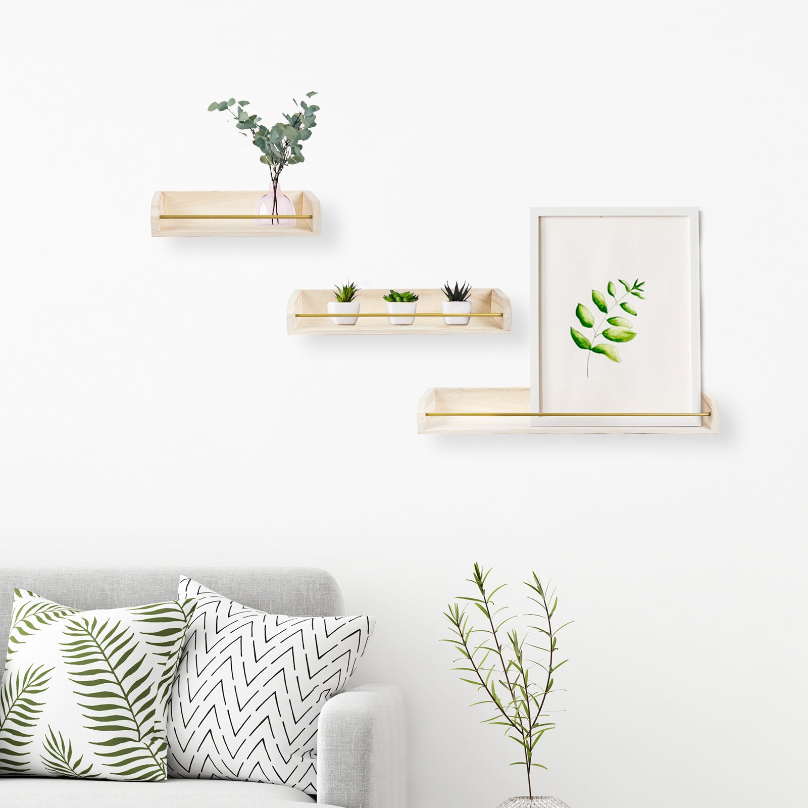 Das dreiteilige Wandregal „Ekby“ ist genau das Richtige für Individualisten. Die drei Wandregale können beliebig an der Wand angeordnet und sowohl als Ablage, als auch für Dekoelemente genutzt werden. Zudem lässt sich unser Wandregal auch noch sehr leicht Montieren und ist dank des modernen Looks in Natur und Gold optimal für jeden Einrichtungsstil geeignet.