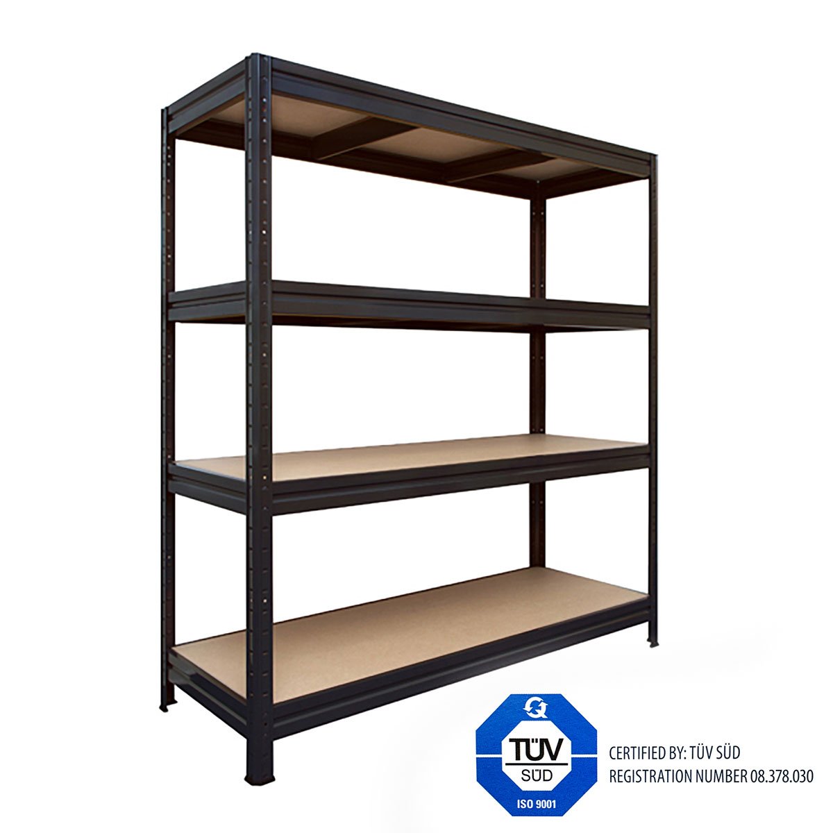 Das schwarze Weitspannregal begeistert durch einfache Montage und eine sehr hohe Traglast. Das Weitspannregal mit den 4 Spanplattenböden kann abhängig von der Regalgrösse pro Boden mit einem Gewicht von 500 kg bzw. 600 kg belastet werden. Das entspricht einer Traglast von insgesamt 1200 kg bzw. 1500 kg.